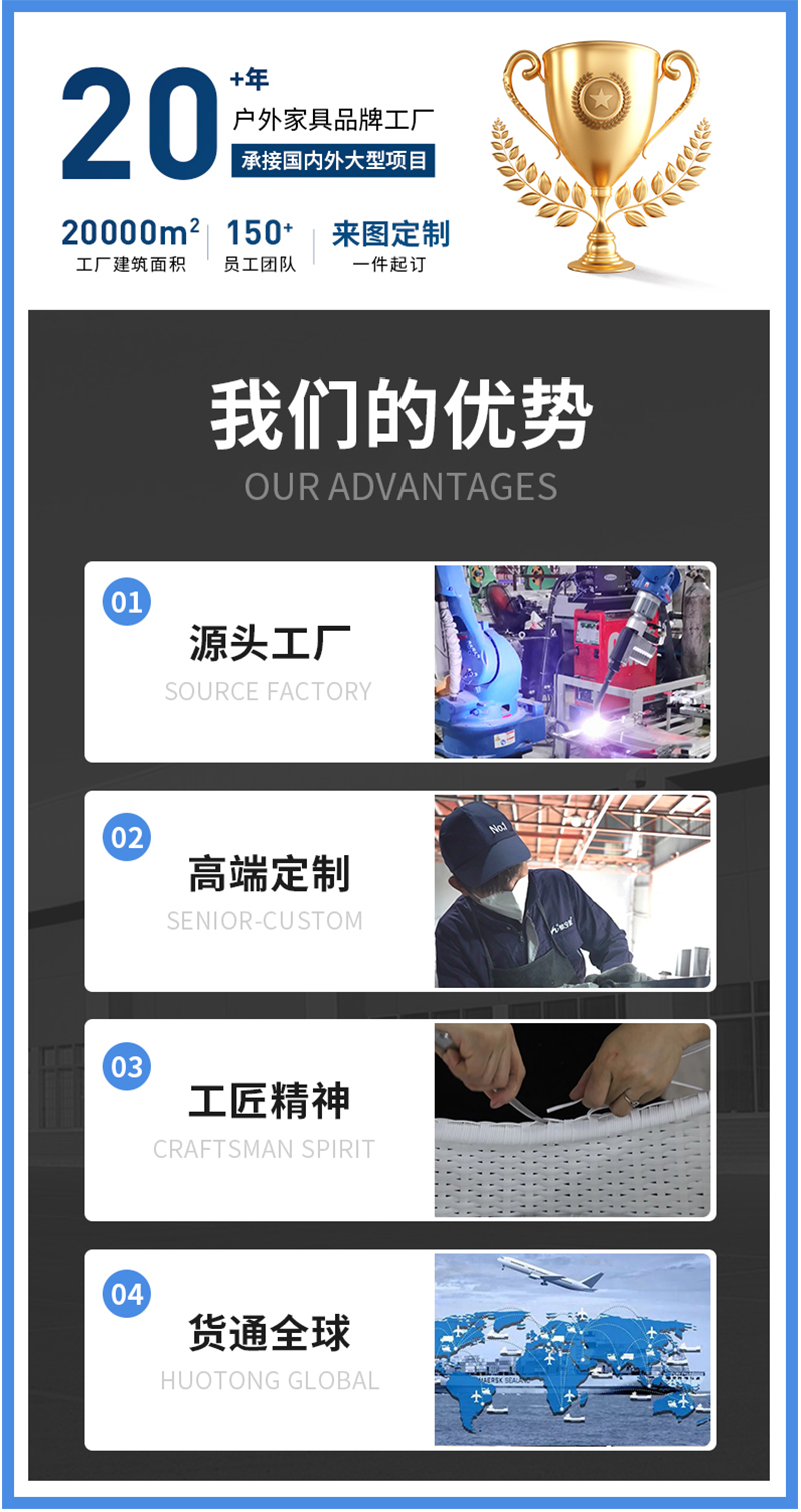 設計(jì)師有感於原始森林粗藤細蔓的(de)戶外旖旎,原料主要用(yòng)環保粗圓仿(fǎng)藤、細圓仿藤、片仿藤與鋁(lǚ)合金框架相結合,結(jié)合中國傳統幾千年的竹編工藝,打造了這一係列(liè)有濃鬱“花園(yuán)城堡、庭院(yuàn)秋千,藤藝桌椅”特色的休閑家具產品