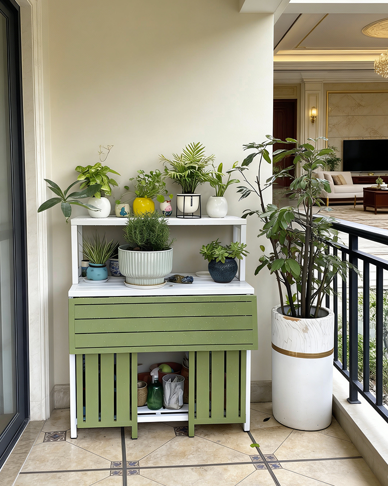 無需(xū)精(jīng)心打理,選擇散尾葵、虎皮蘭、多肉等低維護植物,搭配階(jiē)梯式多功能花架,瞬間打造立體綠意。